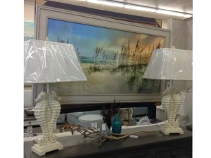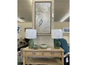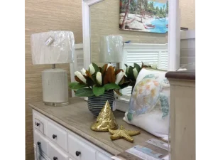 Owl’s Nest Furniture offers lamps, lighting and accessories that play a vital role in enhancing the functionality and appeal of your space. Lamps, available in various styles such as table lamps, floor lamps, and wall sconces, provide essential lighting to your living room while also serving as decorative elements that compliment your coastal style. They can complement or contrast your existing beach style furniture, adding depth and character to the room. Accessories, including items like decorative pillows, throws, rugs, and artwork, contribute to the overall ambiance and low country style. These accessories allow for easy customization and seasonal updates, making it simple to refresh a space without major changes. By carefully selecting and arranging lamps and accessories, you can create a cohesive and inviting environment that reflects your personal taste and enhances the room’s functionality and comfort.